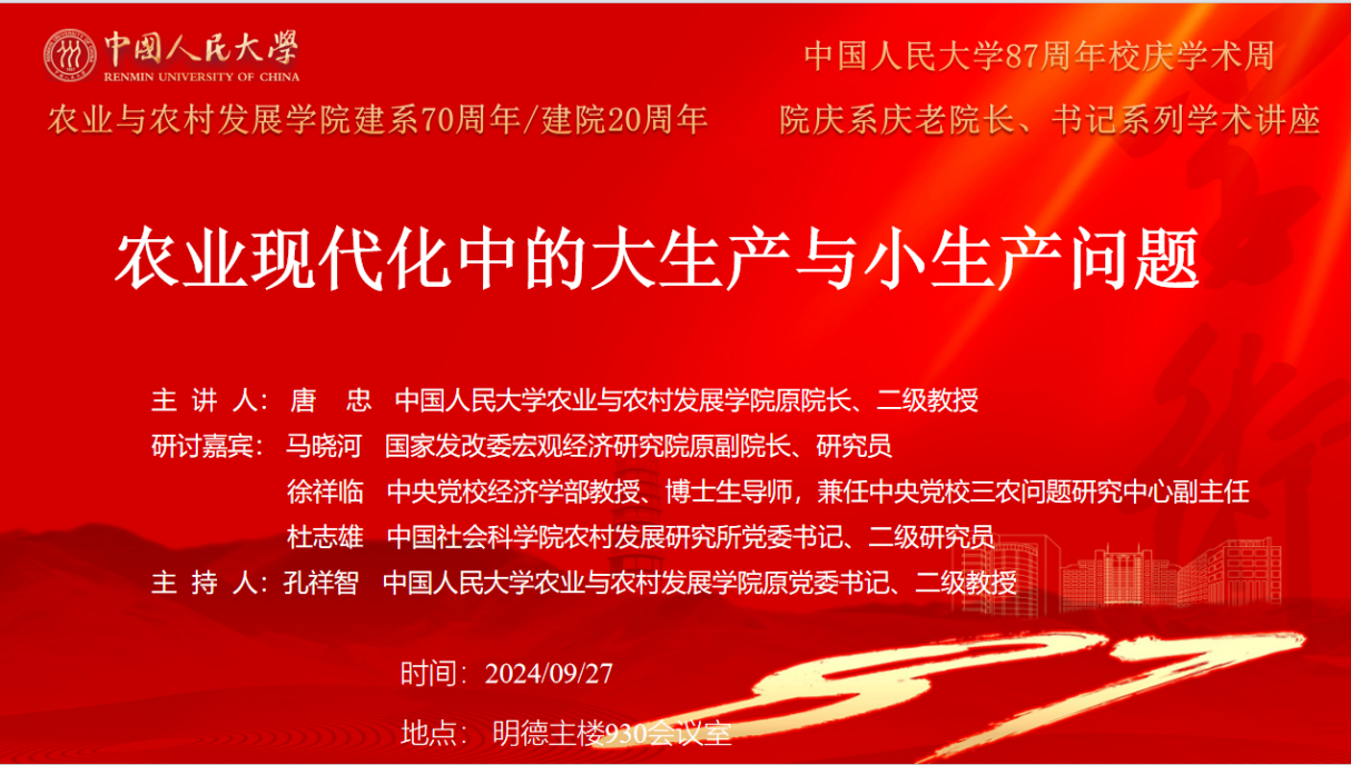 87周年校庆学术周活动||建系70周年/建院20周年 院庆系庆老院长、书记系列学术讲座 || 农业现代化中的大生产与小生产问题
