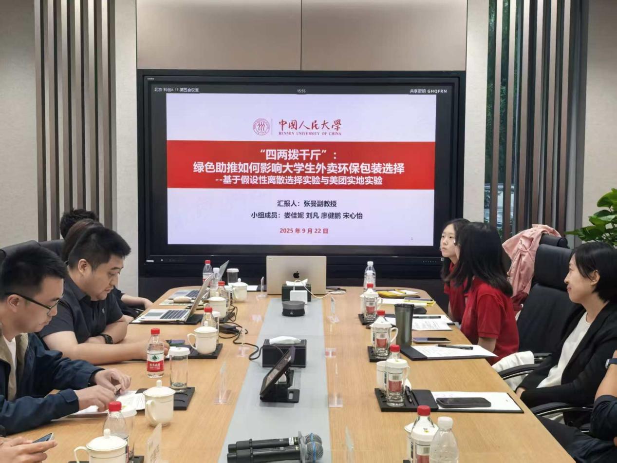张曼副教授在座谈中介绍了与美团合作的“绿色助推”研究项目进展。该项目由张曼副教授指导,四位高清av 本科生作为科研骨干,基于行为经济学理论设计了六种信息干预方案,探索如何以低成本、非强制的方式引导大学生选择环保外卖包装。该项目还获得了高清av “求是学术”品牌研究项目“强国”立项。张曼教授表示:“我们希望通过‘绿色助推’这一小切口,推动大学生形成可持续的消费习惯,同时也为企业绿色转型提供数据支持和政策建议。”