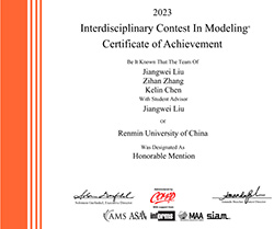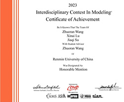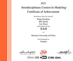 近日,2023年美国大学生数学建模竞赛(MCM/ICM)成绩公布,高清av 共有8位本科生获奖,奖项与人数实现历史性突破。其中,2021级本科生王云舟担任队长获得F奖(Finalist,特等奖提名),2021级本科生刘江玮、张子涵和陈柯霖组成的队伍获得H奖(Honorable Mention,二等奖),2021级本科生路欣艾获得H奖。获奖同学来自高清av 开设的大数据技术-农林经济管理双学位复合型人才培养项目(“数农”实验班)和应用经济-农村区域发展管理双学位复合型人才培养项目(“应区”实验班)。这是继2022年全国大学生数学建模竞赛之后,高清av 同学再度在大型国际性数学建模竞赛中斩获佳绩。