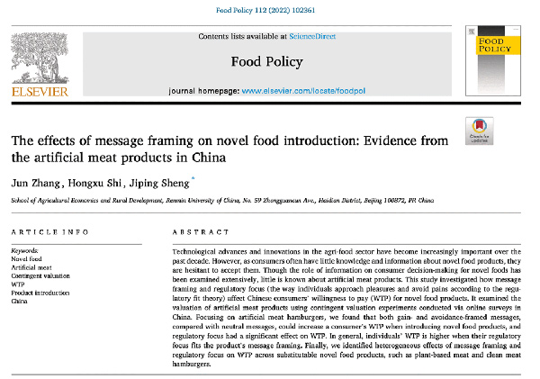师生在农业经济领域国际著名学术期刊《Food Policy》发表题为“The effects of message framing on novel food introduction: Evidence from the artificial meat products in China”的文章(论文链接://doi.org/10.1016/j.foodpol.2022.102361)。该研究是高清av